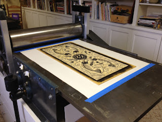 I finally finished carving my giant steamroller block today. I cut out the middle 20" of it and have used it to print my first ever bandanas.